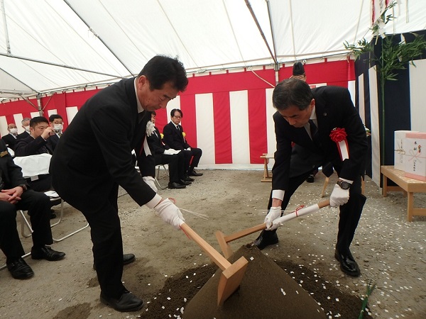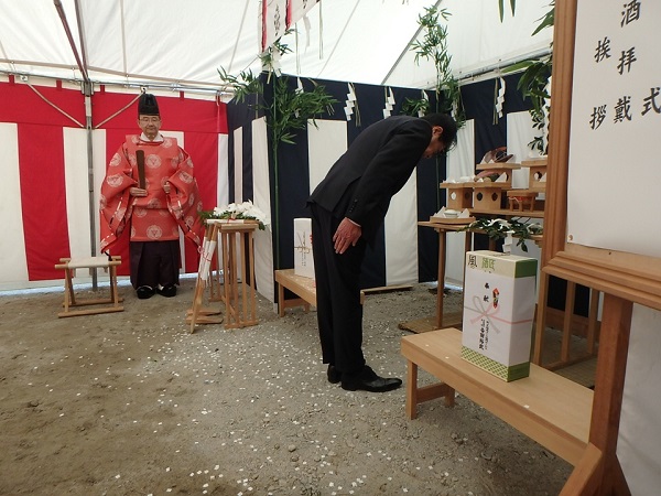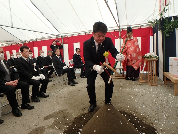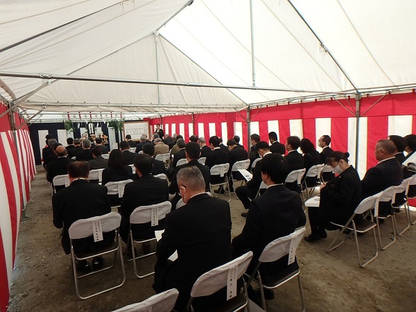 式には工事関係者・設計者及び地権者、福島さくら農業協同組合 志賀博之組合長他理事の方々、株式会社JA福島さくら協同サービス 𠮷田裕武社長を始めとする取締役や職員の方々に参加をいただき、鍬入れの儀、玉串奉奠などの神事を行い工事の安全を祈願しました。