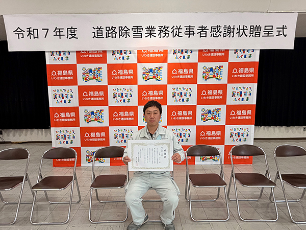 福島県いわき建設事務所所長より、弊社土木部 菅原洋平次長が県発注の除雪業務において5年という長期にわたり、極めて誠実・献身的に業務を遂行。深夜・早朝の急な出動要請に対しても迅速かつ的確に対応し、地域交通の機能維持に貢献してきたことにより感謝状を賜りました。