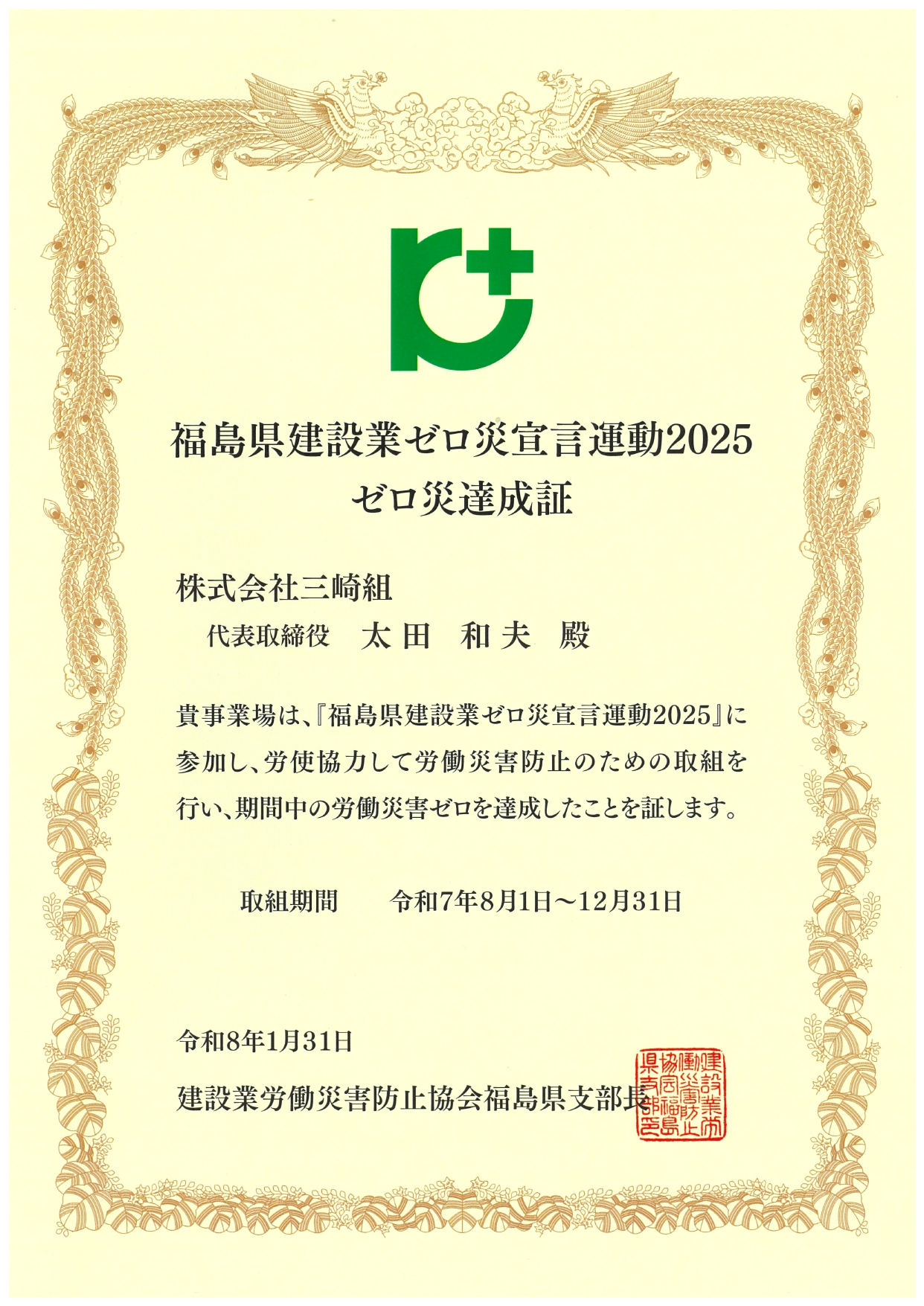 【新着】 「福島県建設業ゼロ災害宣言運動2025」 達成! 2026.04.01 お知らせ 株式会社 三崎組は福島県建設業ゼロ災宣言運動2025に参加し、期間中の労働災害ゼロを達成いたしました。 今後とも災害防止に関する習慣や工事現場でのより高い安全意識の高揚を図り労働災害に努めてまいります。
