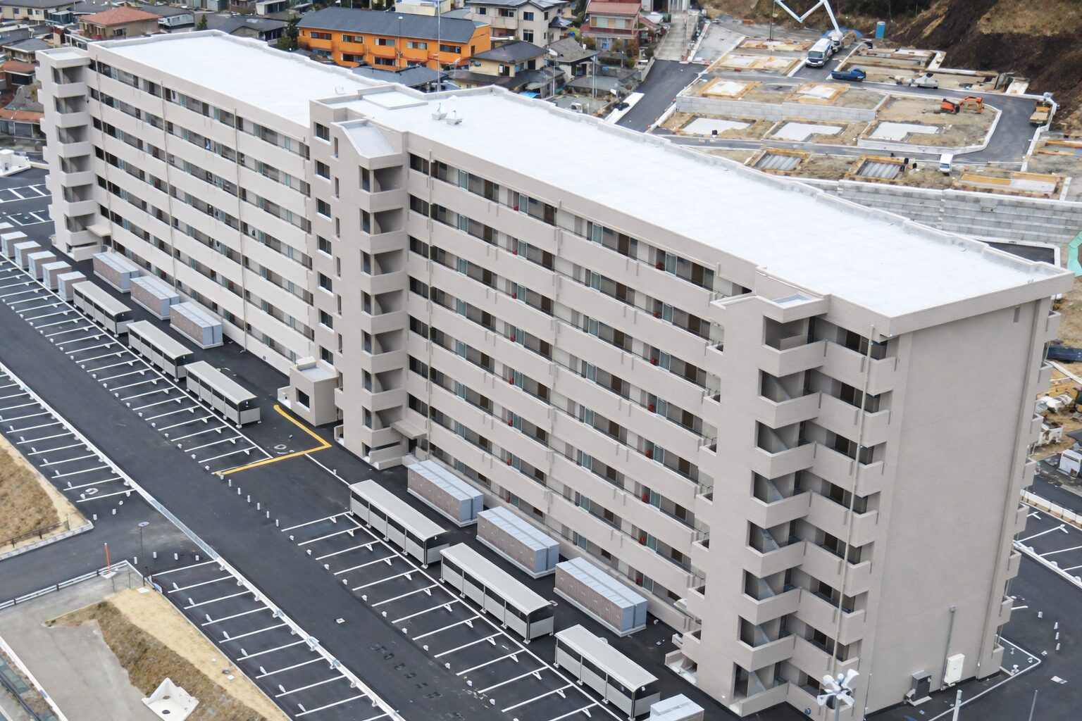 | 施工面積(工事概要) | 新築 災害公営住宅1号棟(7階)・2号棟(8階) 鉄筋コンクリート造 建築面積 A=1385.31㎡ 延床面積 A=9088.61㎡ 地上の高さ 1号棟 H=22.38m 2号棟 H=25.7m アスファルト防水工 A=1705.8㎡ 塗膜防水工 A=75.5㎡ 集会所 鉄骨造 延床面積 A=327.39㎡ |